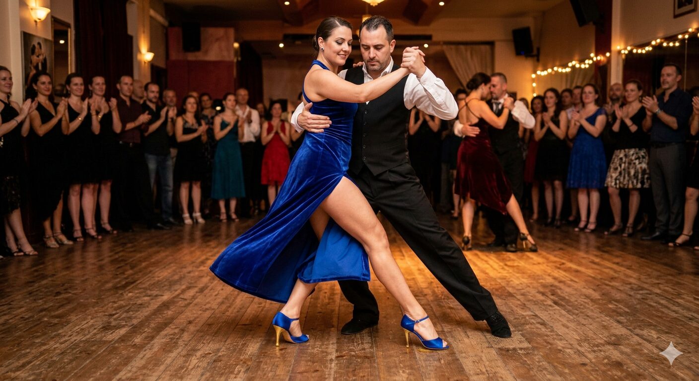 プグリエーセ版「El Adiós」はタンゴの中でも特に感情的な深みを持つ一曲です。重厚なリズムと劇的な表現が特徴で、ミロンガで流れると会場全体が静かな緊張感に包まれます。別れの悲しみと消えない愛の記憶をステップで表現することで、見る者すべての心を動かすパフォーマンスが生まれます。